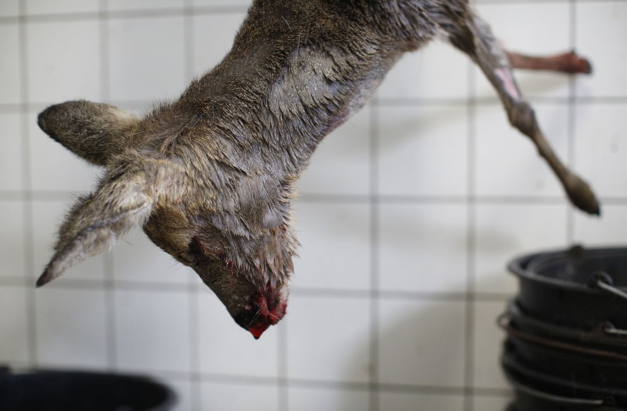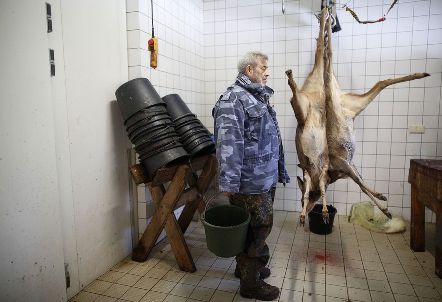 A dead deer hangs in a feeding prep room at Wolfspark Werner Freund, on January 24, 2013.