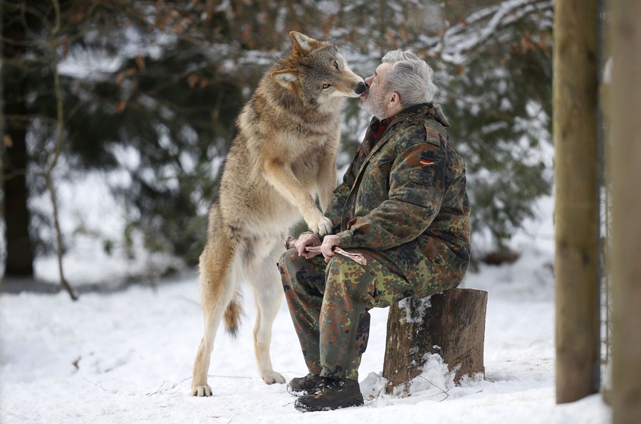 Mongolian wolf Heiko licks the mouth of wolf researcher Werner Freund in a sign of acknowledgement, on January 24, 2013.