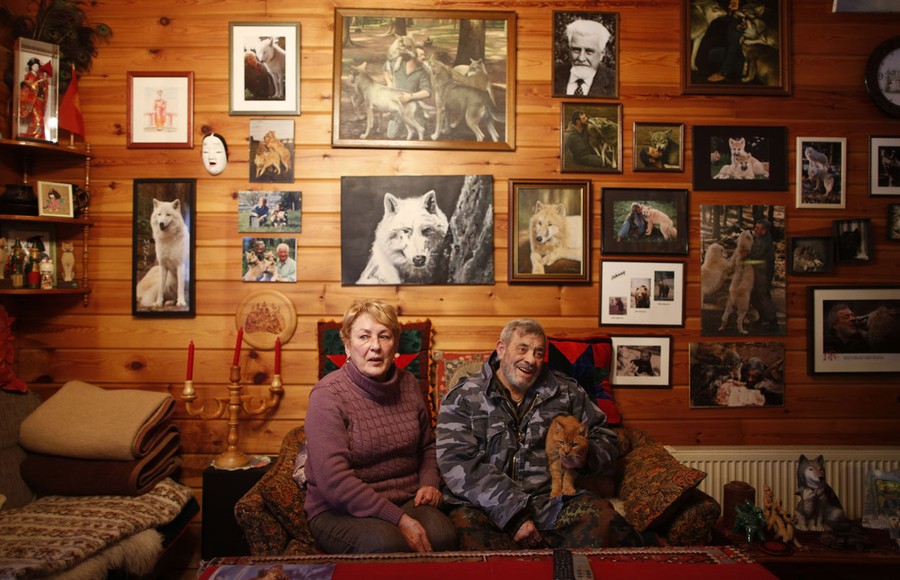 Wolf researcher Werner Freund, his wife Erika and their cat Max sit in the living room of their home near the wolf sanctuary, in Merzig, on January 24, 2013.